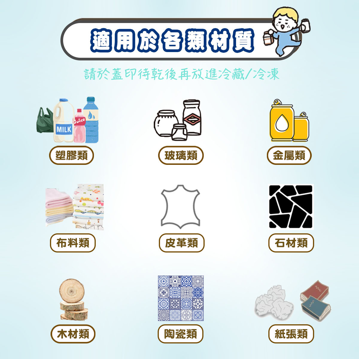 搭配同品牌【油性墨水】就可蓋於 光滑面的材質,如塑膠、金屬、食品包裝袋、鋁箔袋等喔。